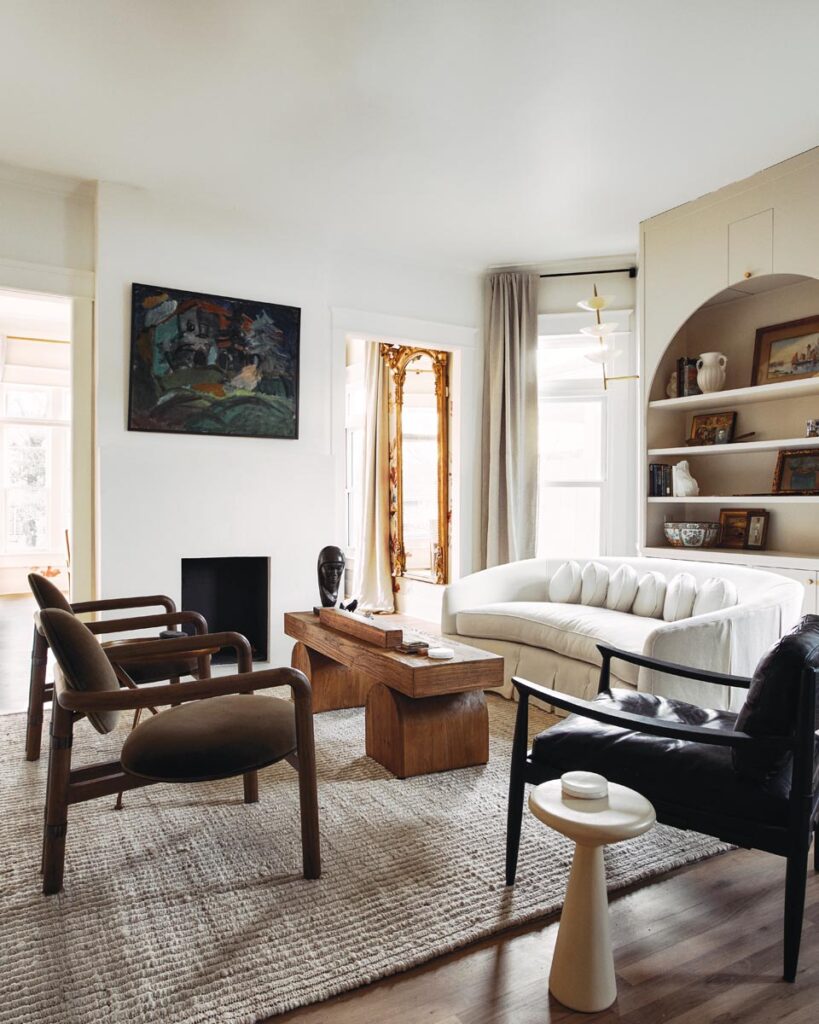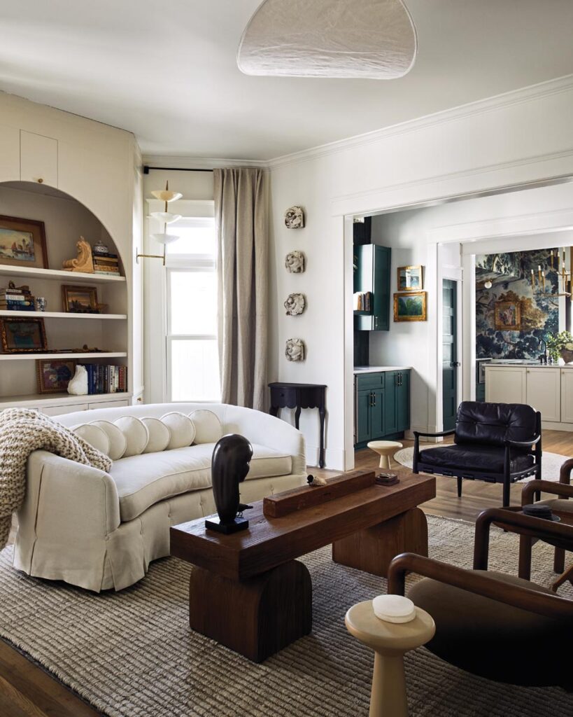 Each room evokes a different feeling for Zumwalt. The entryway evokes joy. Then, the primary bedroom brings calm, as does the living room. A hidden projector is tucked into the top of the arch of a built-in in the living room, and across the room a screen drops down over some architectural salvage pieces, for whenever they want to relax even more with a favorite movie. And in the bedroom, another TV is hidden when not in use.