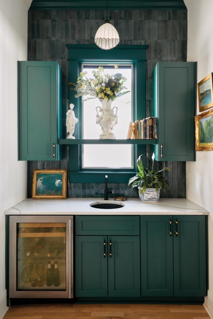 But the kitchen is a little more dynamic, with hardly any white in sight. They opted for green cabinets, bold wallpaper and gold hardware, with a massive chandelier over the island.