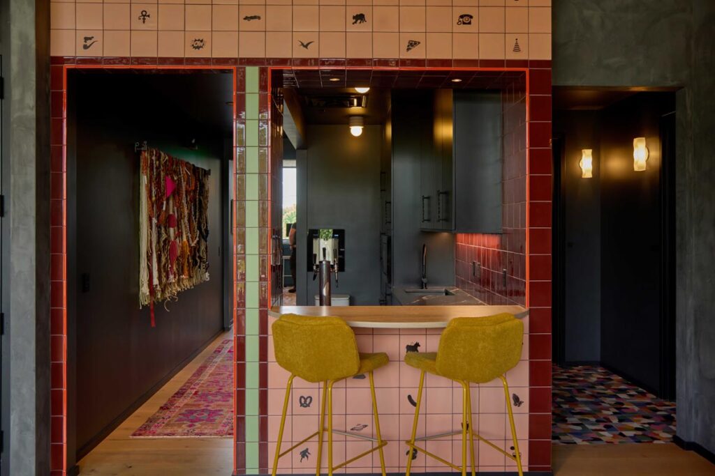 Along with “Project Palettes,” the Nashville surface design studio teamed with Powell and fellow locals Red Rock Tileworks on custom kitchen bar tiles that tell another visual story. The concept: a bodega that only sells things that begin with the letter P, for Powell.
