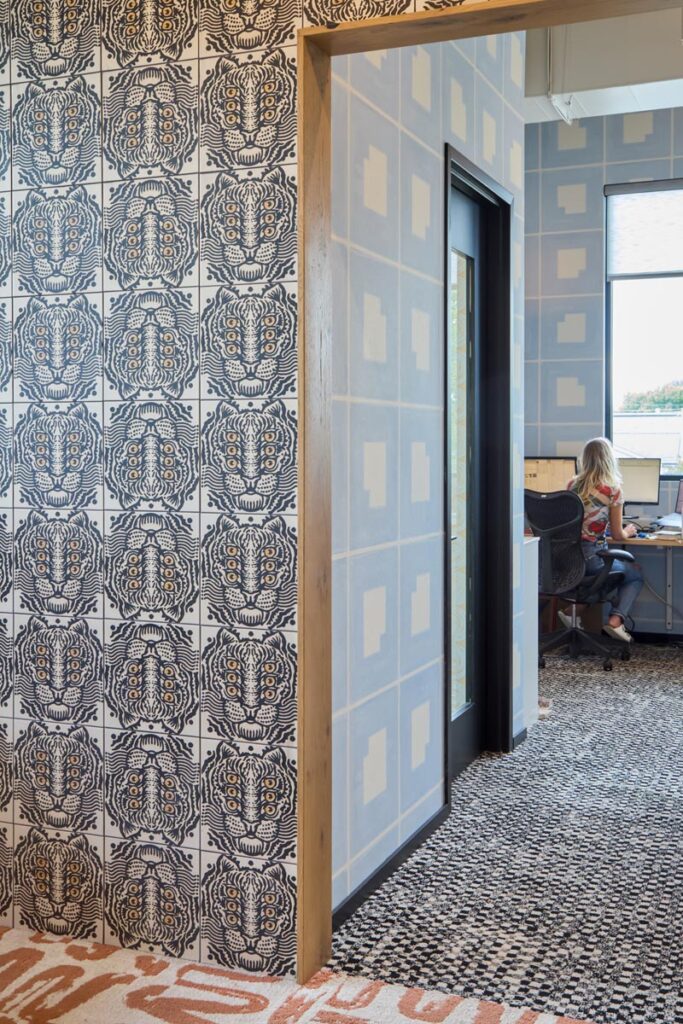 Still, Powell isn’t closed off to off-the-shelf finishes, when they’re inspiring and fit the project. In the HQ’s open workspace, floor-to-ceiling feature walls showcase “WILD,” a loud and powerful tile design from Nashville’s Haustile, featuring abstract tiger shapes with six gleaming eyes.