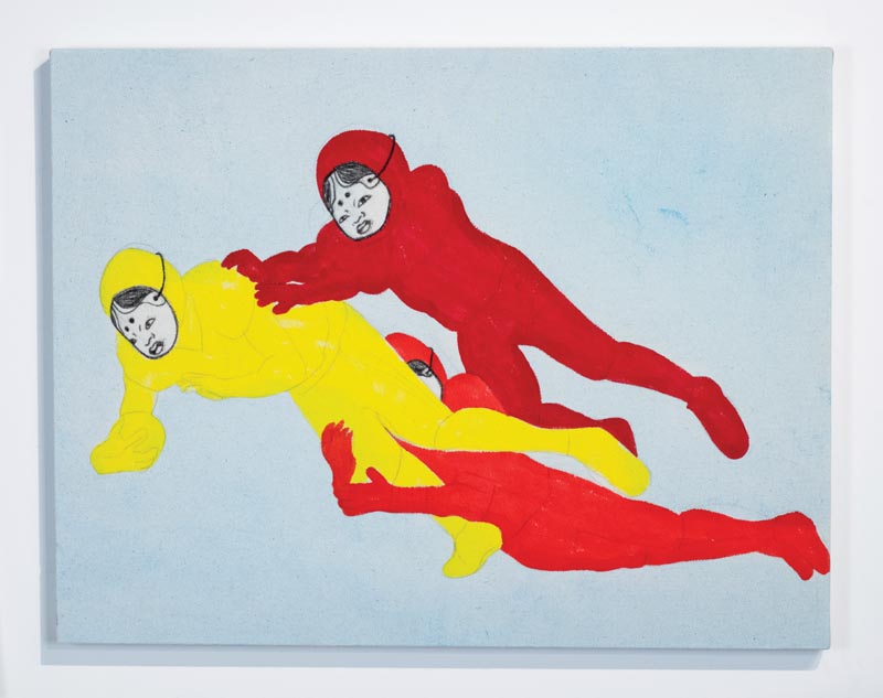 While Clayton’s paintings are vividly illustrated with heavy lines and bright colors, they clearly feel more at home in a fine arts environment. The influence of animation, however, extends beyond the aesthetic and into the narrative world-building where her characters exist.