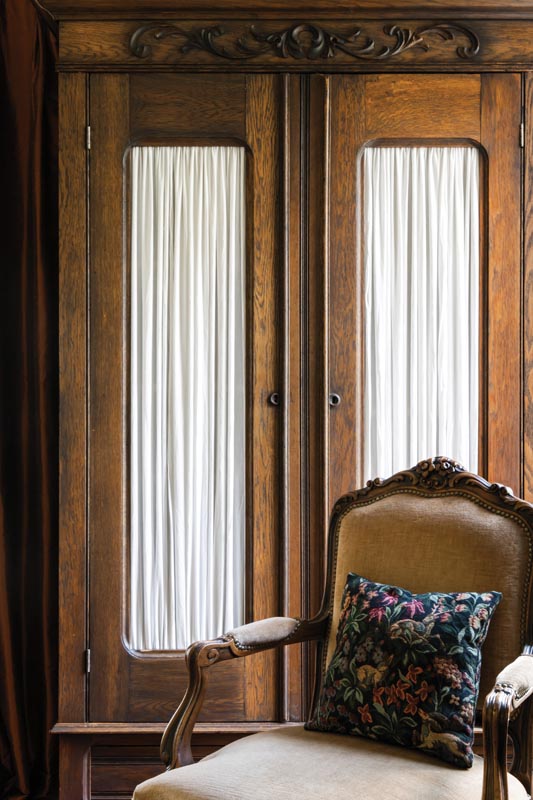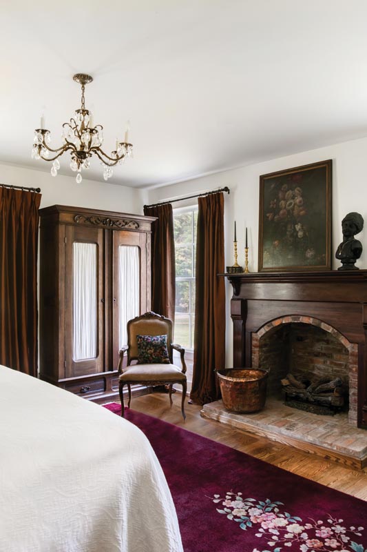 In the primary, a tall armoire with light curtains anchors the space. It’s one of the few close-to-period-appropriate antiques in the restored and reimagined home.