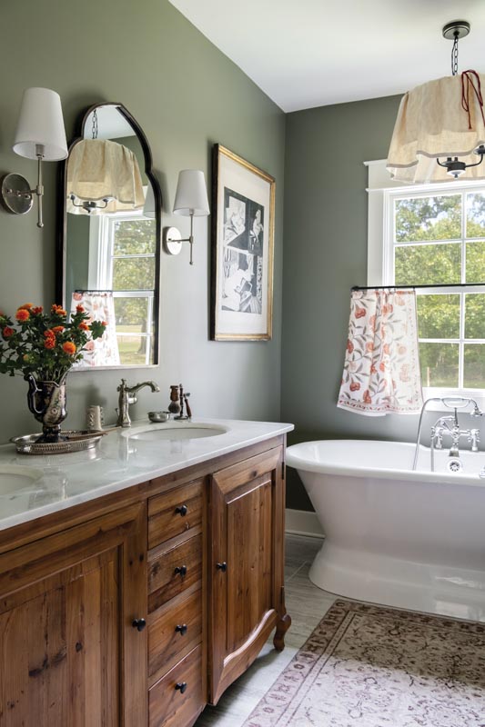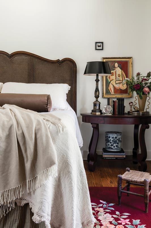 For the living room, the Stacey team found an antique rug and a cache of vibe-setting paintings at Debbie Mathews Antiques & Designs in nearby Nashville. They pulled pint-sized vintage chairs up to an easy antique coffee table. They added a tapestry found at a flea market in Paris, and made pillows out of vintage overshot blankets and new floral fabric that’ll be part of the forthcoming Sarah Stacey fabric and wallpaper line, likely out in 2026.