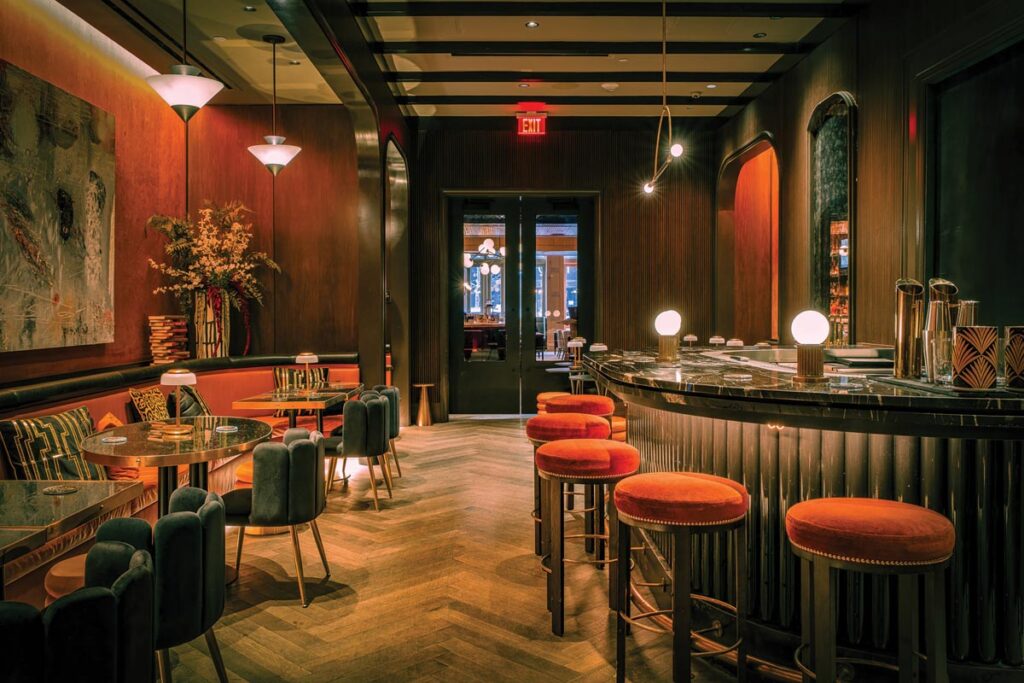gold accents, velvet bar stools, and rich emerald and sunset hues to evoke the glamour of the Roaring Twenties.