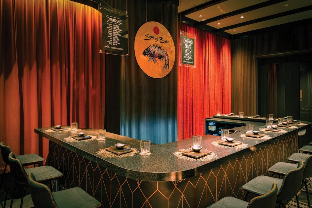 when pulled back, presents a 14-seat sushi counter where guests can witness the artistry of omakase chefs.