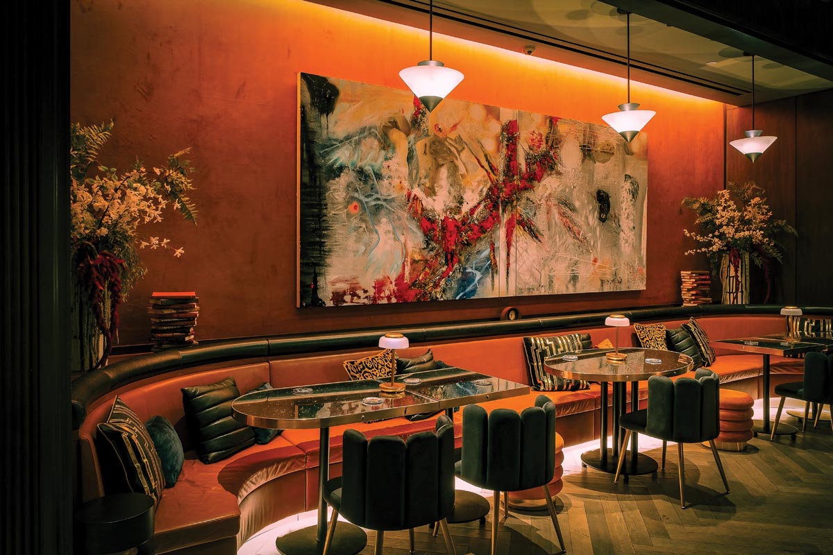 gold accents, velvet bar stools, and rich emerald and sunset hues to evoke the glamour of the Roaring Twenties.