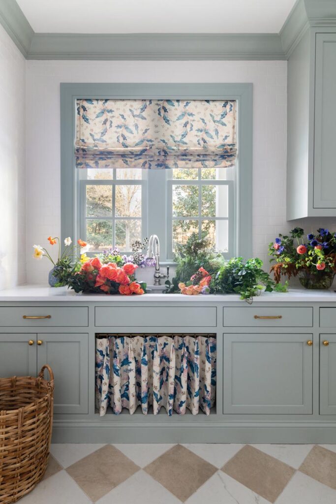 The butler’s pantry, color-drenched in high-gloss green, makes a statement against the elegant dining room, framed by classic floral drapes. In the kitchen, green pendants pop against light cabinetry, warmed up by unlacquered brass. In the scullery, Inchyra Blue from Farrow & Ball makes functional fun.