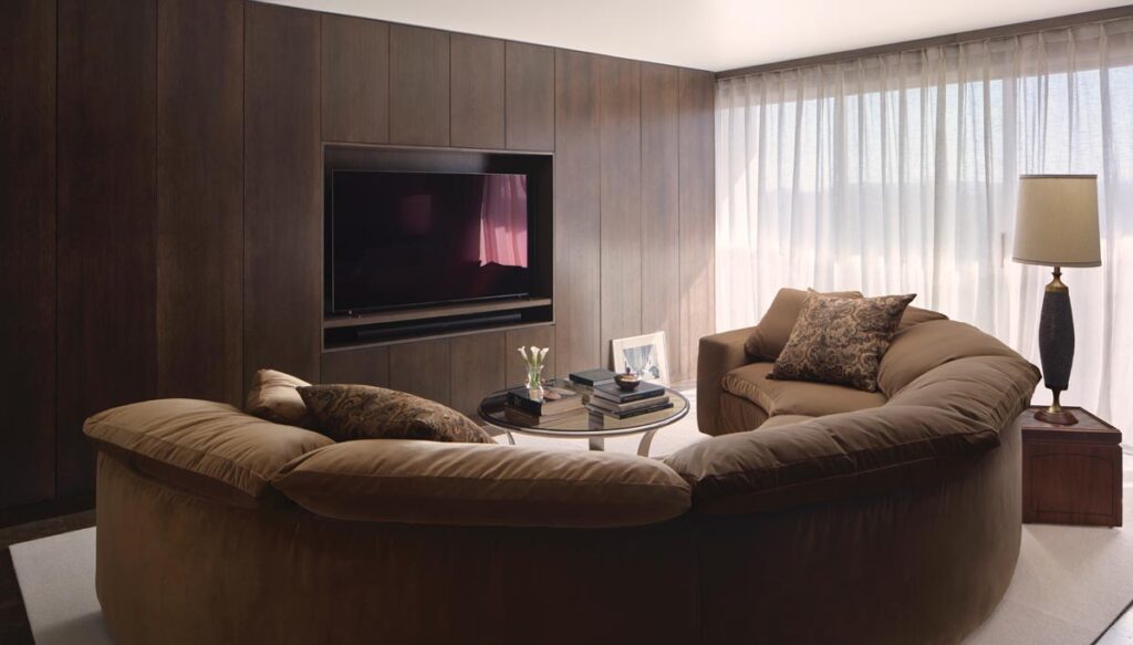 Floor-to-ceiling walnut paneling covers many of the Windsor walls, from the living room into the dining room and beyond. The wood adds warmth, texture and retro energy, and it hides a bunch of practical pluses.