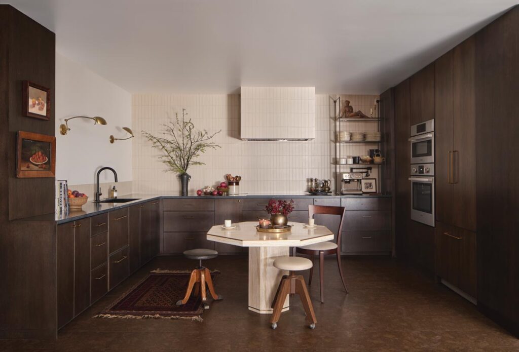 In the kitchen, tiles are bright and light, lines are clean and classic, and an octagonal table takes the space an island might, carrying contrast (and avoiding pointy corners).